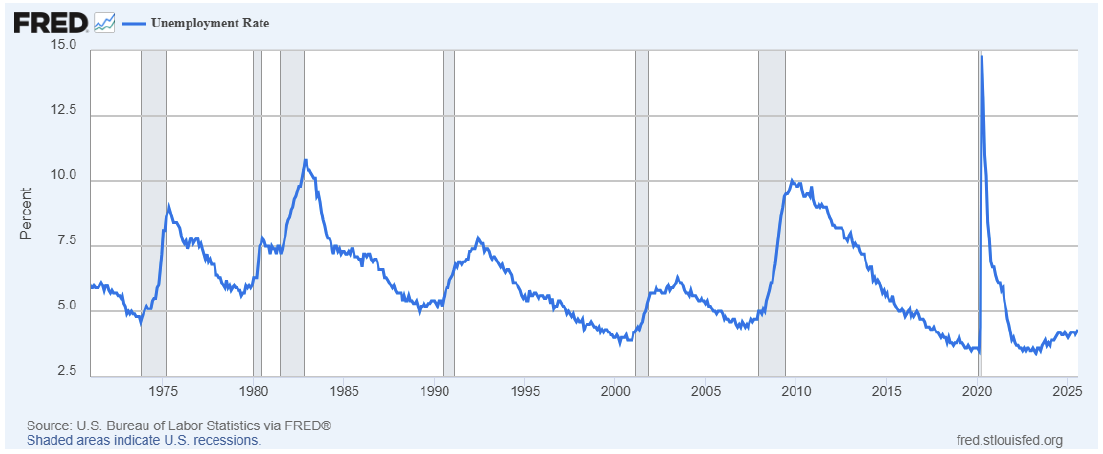 Let’s continue forward.  What about the unemployment rate?  Still at 4.3% as of August 2025 (see earlier chart), which is barely above the 4.1% rate this time last year and still represents the lowest unemployment rate we have seen in this country since 1970 save a few peak months over the last 55 years.  If AI is coming to take all of our jobs away along with Sarah Connor, it apparently has not arrived just yet.