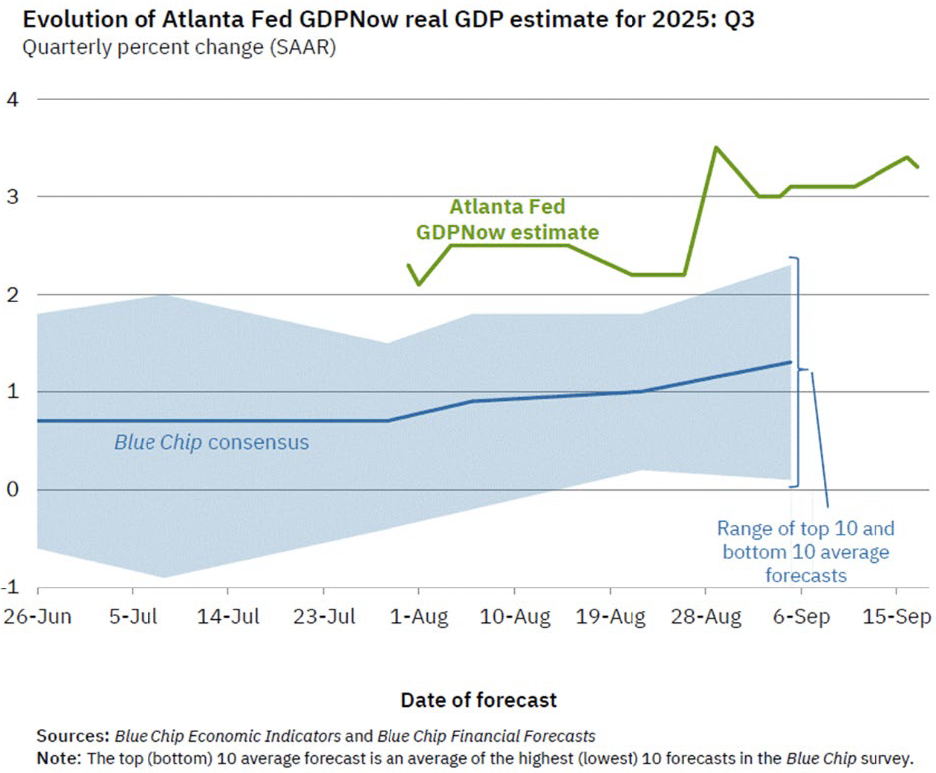Let’s start with the economy.  Despite worries about the recession in the U.S. that was supposed to arrive in 2022, then 2023, then 2024, and now 2025 but never, ever actually shows up, the U.S. economy remains strong.  Consider the latest estimates for Real GDP growth for 2025 Q3.  In a pattern we have seen repeat itself over and over and over again over the last several years, the actual data is signaling a much stronger economy than what the handwringing “Blue Chip” economist consensus is predicting how the economy will perform.  For while the “experts” were projecting U.S. Real GDP growth will increase by less than 1% this quarter, the data signals that it is on pace to exceed 3% on a quarterly percent change basis.  This is not only growth, but strong growth that continues to persist beyond expectations.