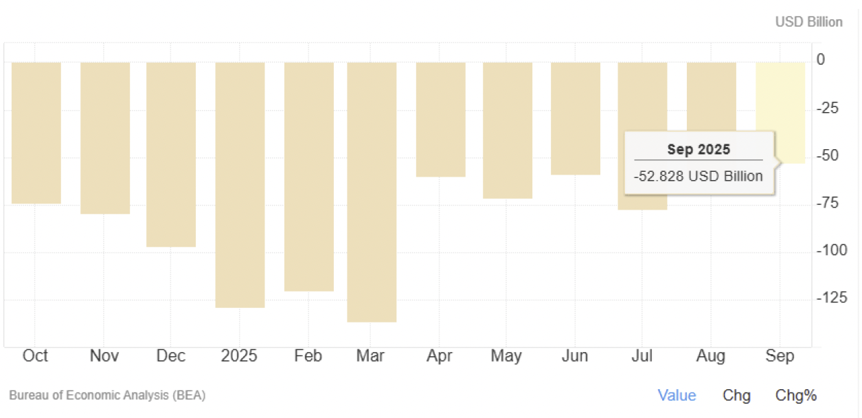 The trade backdrop is already moving in a supportive direction. The U.S. recorded a trade deficit of $52.8 billion in September 2025, the lowest since June 2020. This compares to a $59.3 billion deficit in August and forecasts closer to $63 billion. Exports rose 3% to $289.3 billion, the second-highest level on record. While recent headlines around Venezuela have led some to assume a coming glut of oil supply, I remain skeptical of that conclusion.